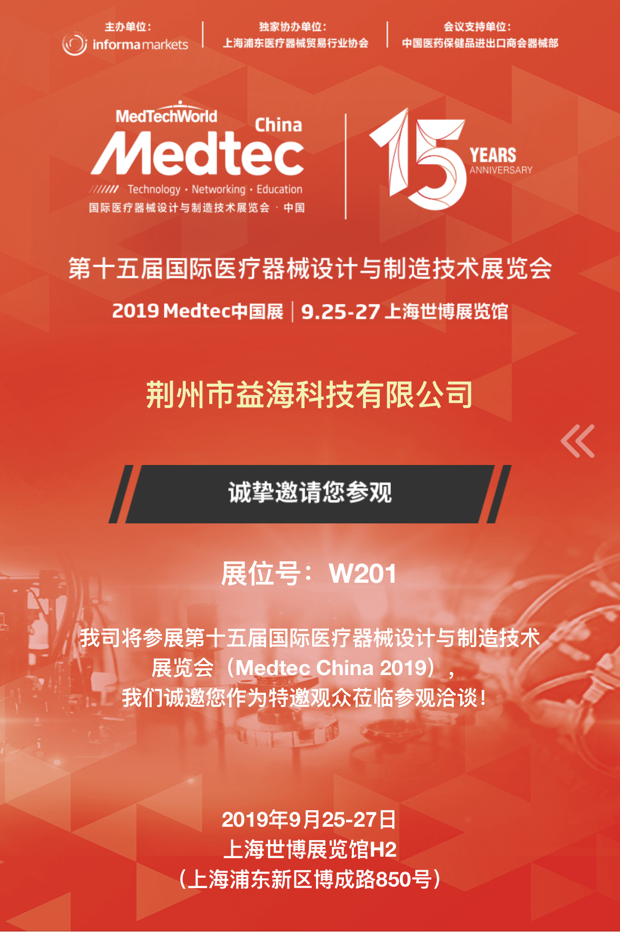 我司將參展第十五屆國際醫(yī)療器械設計與制造技術展覽會(Medtec China 2019),展位號:W201.我們誠邀您作為特邀觀眾蒞臨參觀洽談!